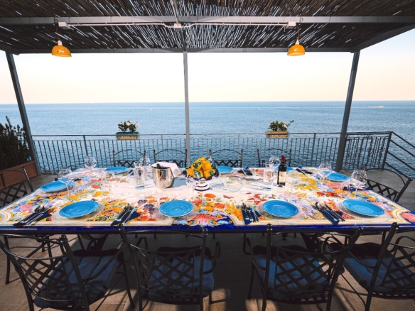 Coastal villa terrace with breakfast table overlooking the sea in soft morning light