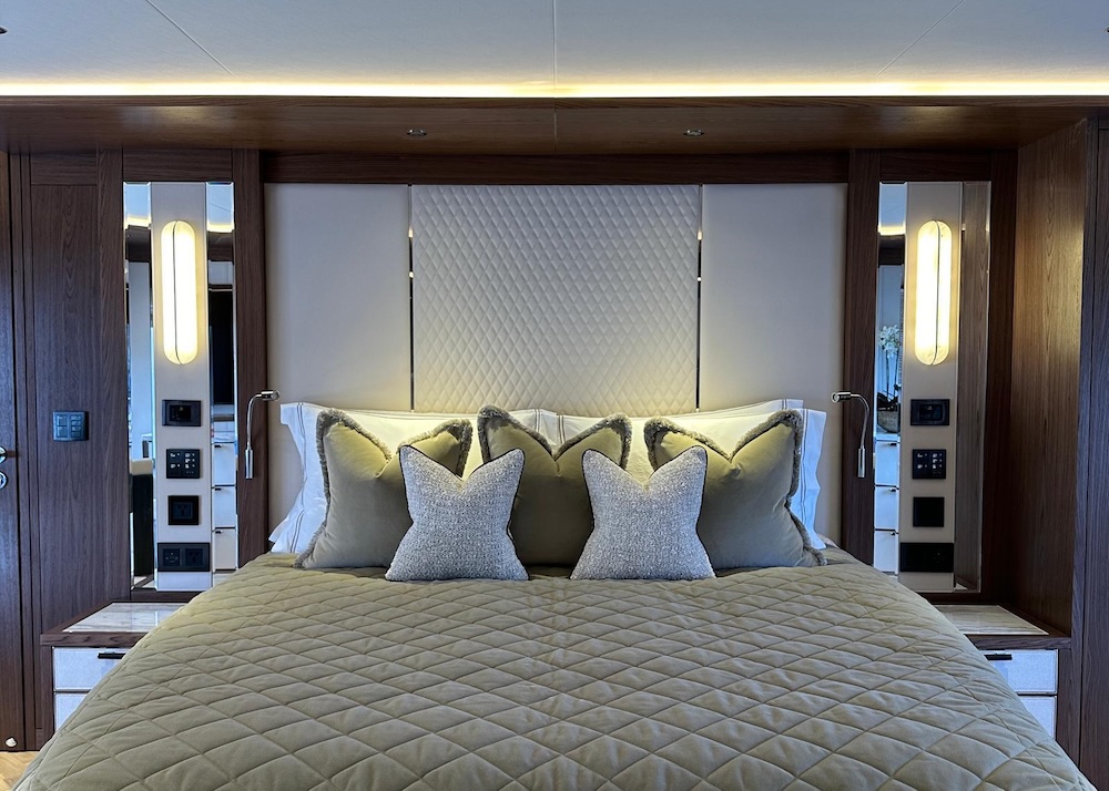 Accommodation aboard MAJERA is arranged to offer privacy, comfort, and flexibility. A full-beam master cabin on the main deck is a defining feature, offering floor-to-ceiling windows and direct access to a private foredeck with jacuzzi — a rare layout that gives the principal guests both space and independence.