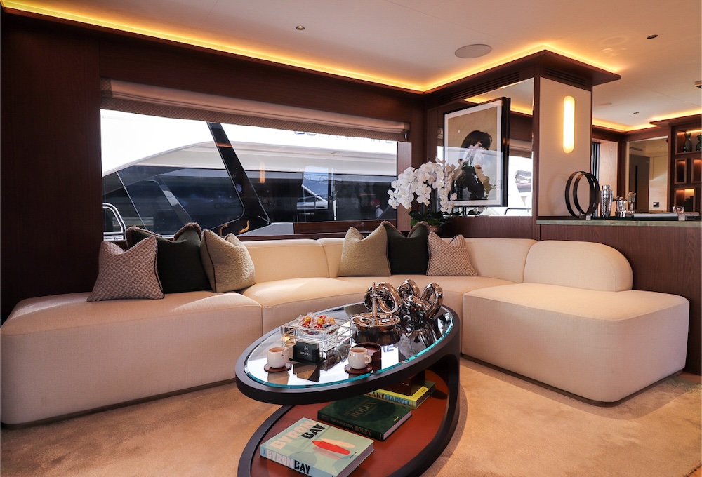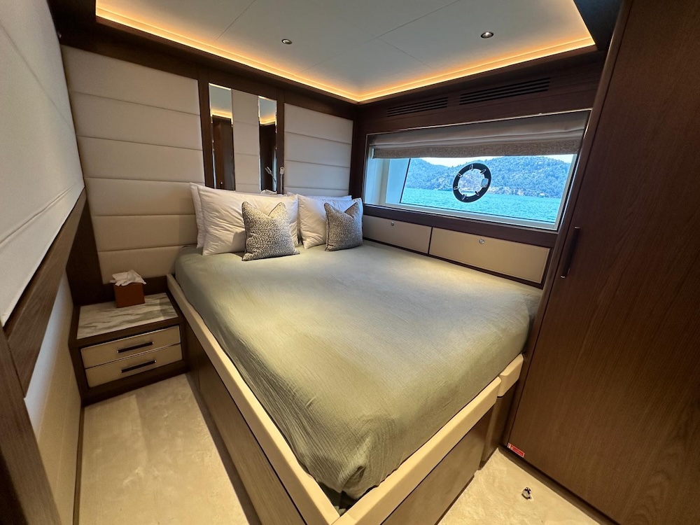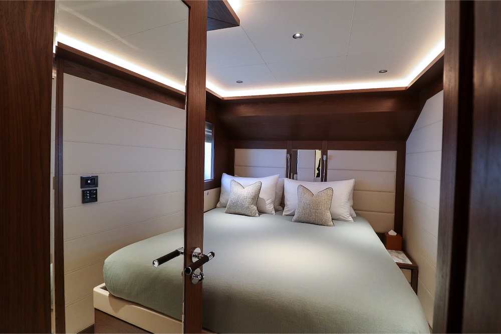 Below deck, the remaining cabins include a forward VIP, two convertible twin cabins, and an additional guest berth, allowing the yacht to adapt comfortably to families with children or mixed adult groups. Interiors are contemporary and warm, with clean lines, soft lighting, and wide windows that bring daylight deep into the living spaces.
