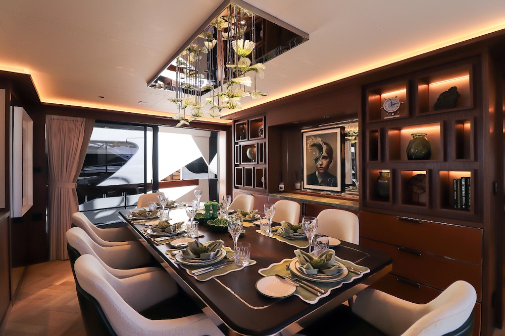The foredeck jacuzzi, accessed directly from the master cabin, adds an additional layer of flexibility, allowing guests to spread out and enjoy different areas of the yacht without crowding. At the stern, the tender garage transforms into a beach-style swim platform, creating easy access to the sea and water activities.