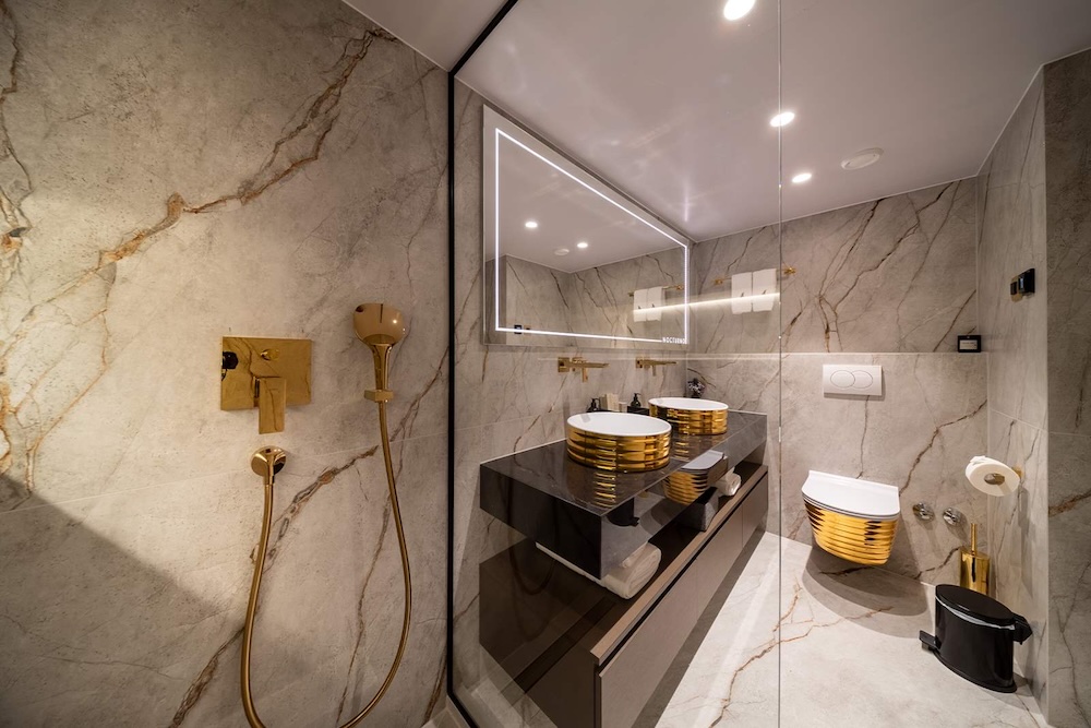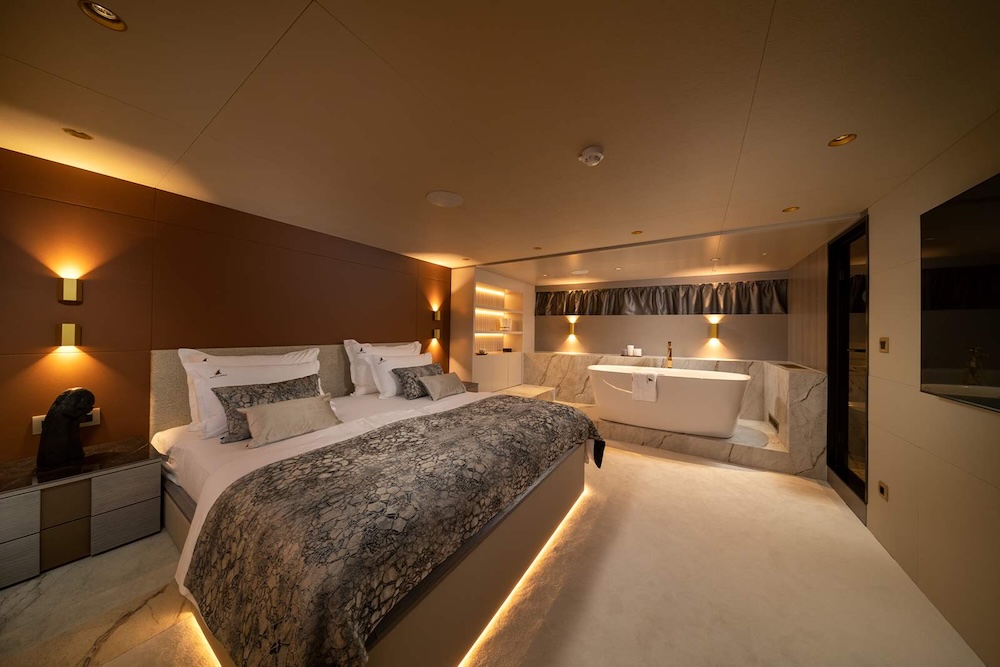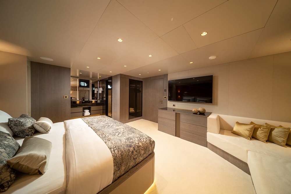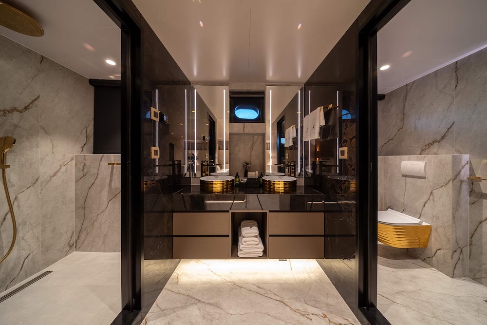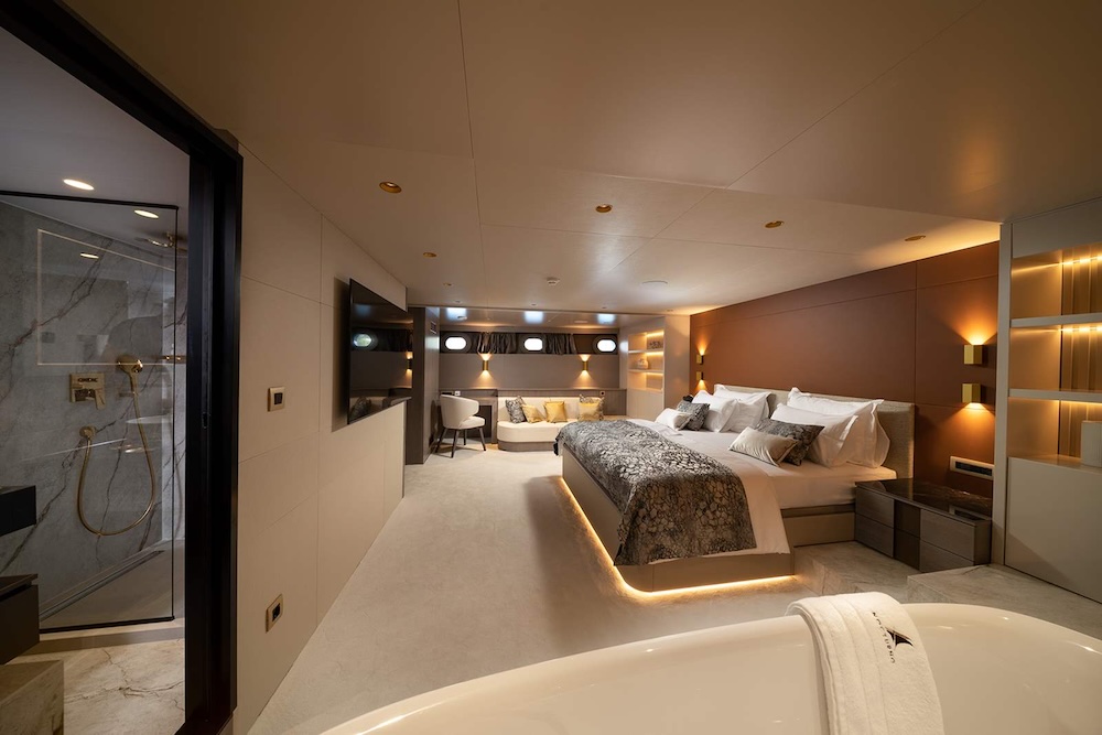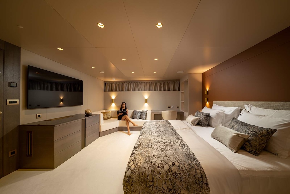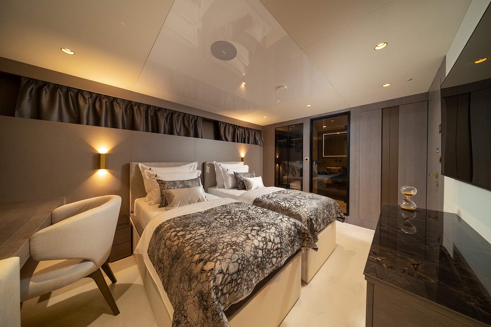 Accommodation aboard NOCTURNO is arranged to provide both privacy and consistency across the yacht. The layout includes a full master cabin, a spacious VIP cabin, two double cabins, and two convertible twin cabins, all with en-suite bathrooms and full air conditioning.