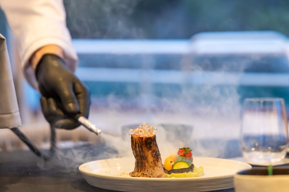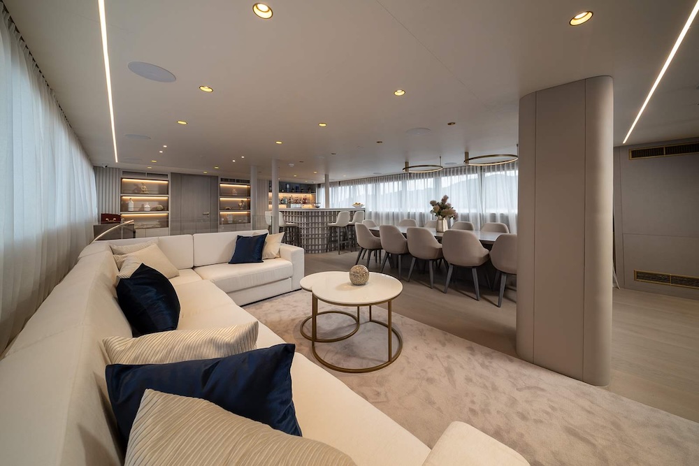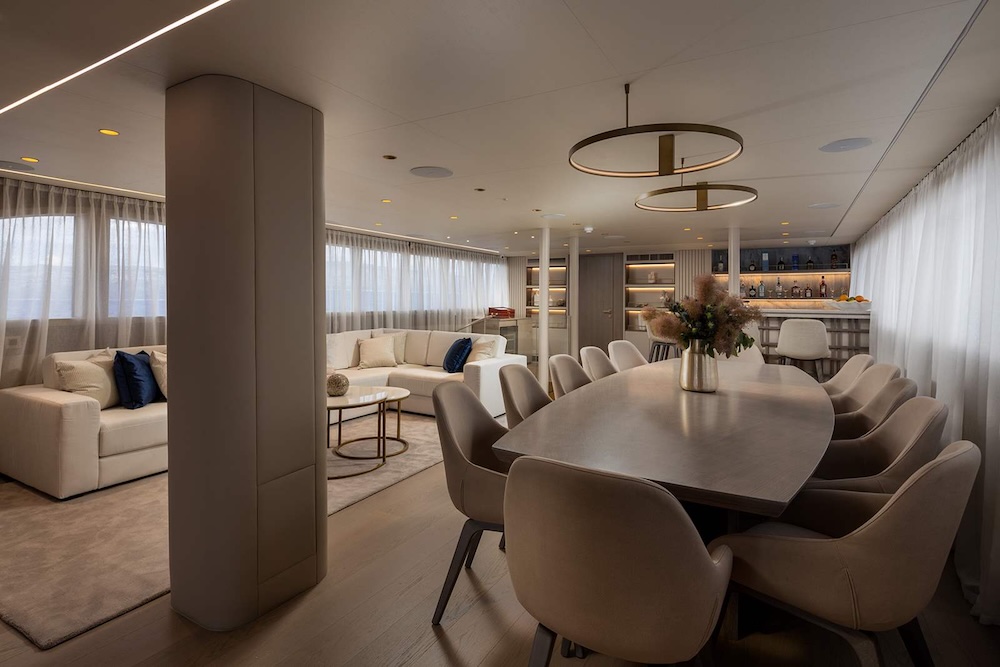 Interiors are contemporary and elegant, with soft materials, warm tones, and wide windows that bring in natural light. The main salon combines dining, lounge seating, and a bar area into one generous space that supports shared time together without feeling formal or confined.