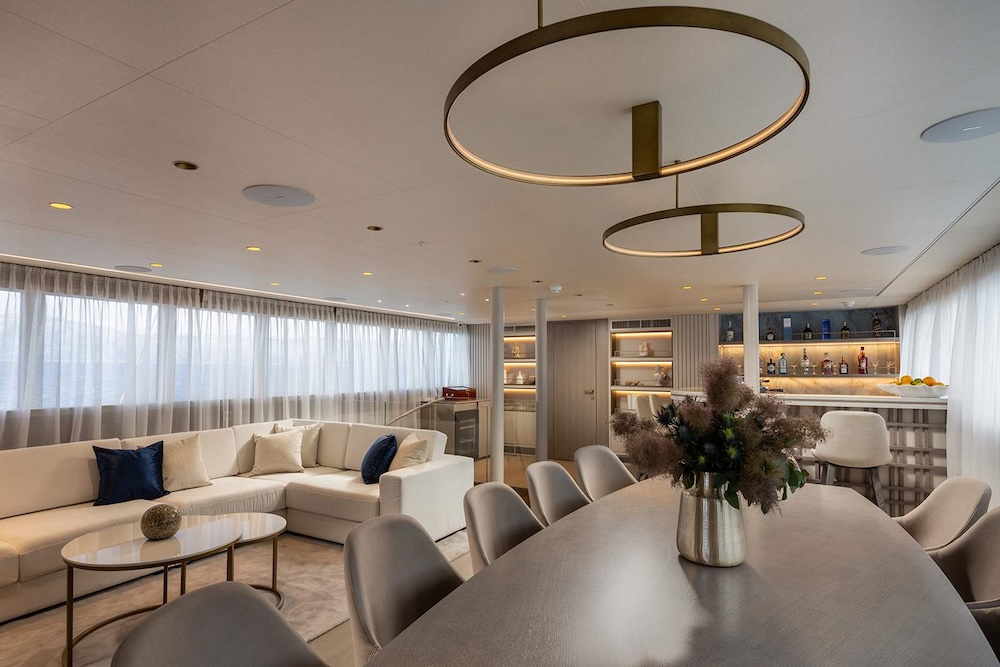 At 48.2 metres, NOCTURNO accommodates up to twelve guests across six generously sized cabins and is supported by a professional crew of nine. This balance of scale and service allows the onboard experience to feel unhurried, well organised, and reassuring for families and larger groups.