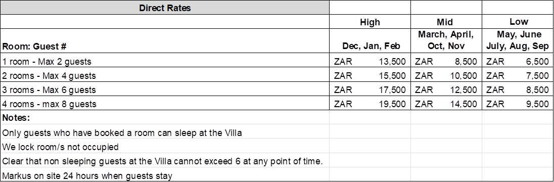 Rates vary depending on the number of bedrooms reserved and the season. Availability and final pricing can be confirmed upon request.